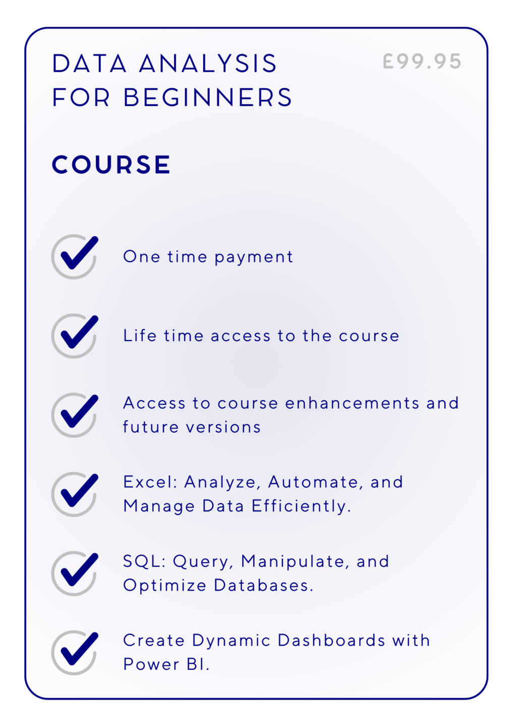 Our bootcamp is designed for individuals seeking a structured, engaging, and results-driven learning experience.Ā Self-study, live sessions, certification, personal 121 coaching, online community and more.... Once completed, weĀ guarantee you'll beĀ able toĀ land a role as a Data Analyst or get your money back